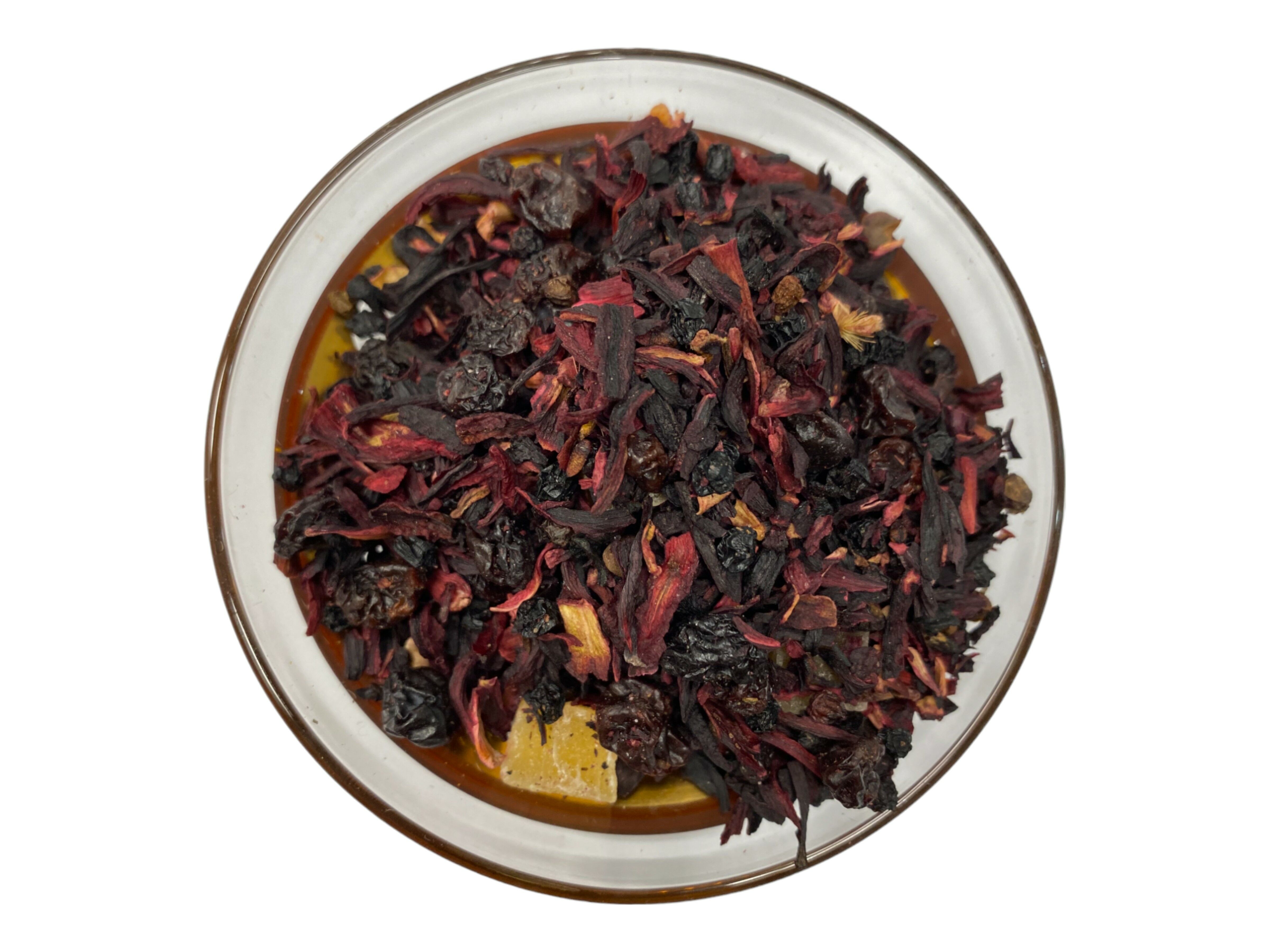 Hibiskusblüten, Korinthen, Holunderbeeren, Ananasst., schw. Johannisbeeren, Himbeeren, Aroma.