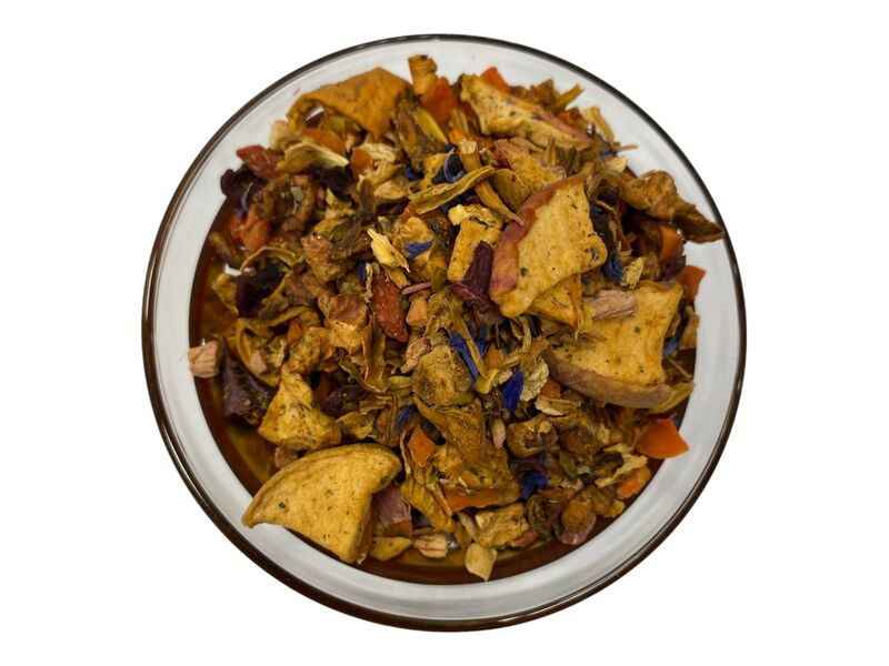 Zutaten: Apfelstücke, Hibiskus, Karottenflocken, Granatapfelkerne, Apfelchips, Rote Bete, Gojibeeren (enthalten SCHWEFELDIOXID), Aroma, Rhabarberstücke (2,5%), süße Brombeerblätter, Kornblumenblüten.