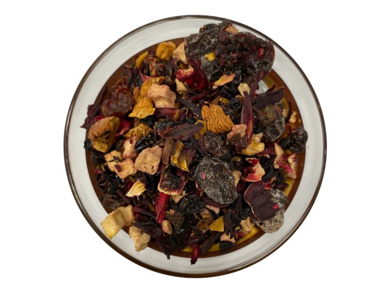 Zutaten: Hibiskusblüten, Hagebuttenschalen, Apfelstücke, Orangenschalen, Aromen, Cranberryscheiben, Sauerkirschen