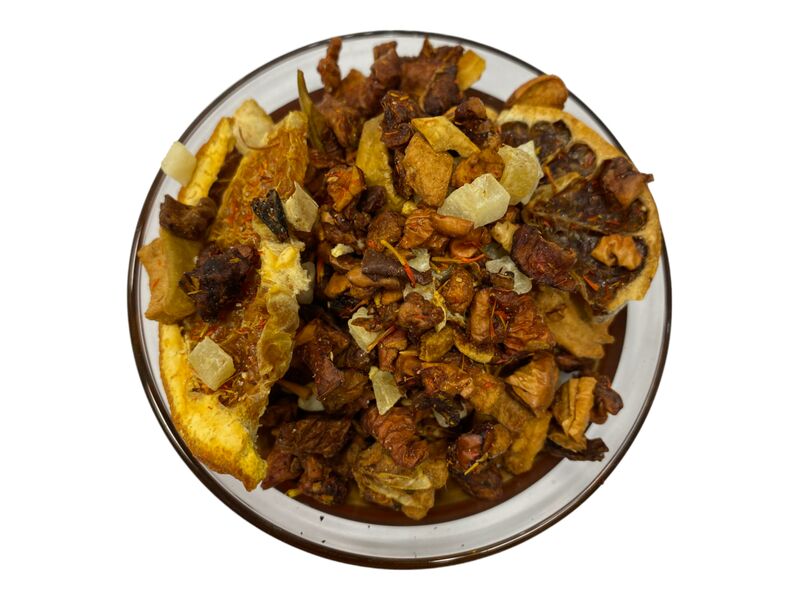Apfel, kandierte Ananasstücke, kandierte Ingwerstücke, natürliches Aroma, Mandarinenscheiben, Orangenschalen, Walnussstücke, Saflorblüten