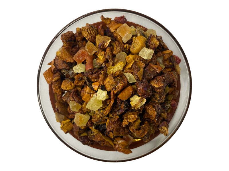 Apfelstücke, Papayastücke, Zitronenschalen, Feigen, Datteln, Aroma, Granatapfel, Malven, Lichee.