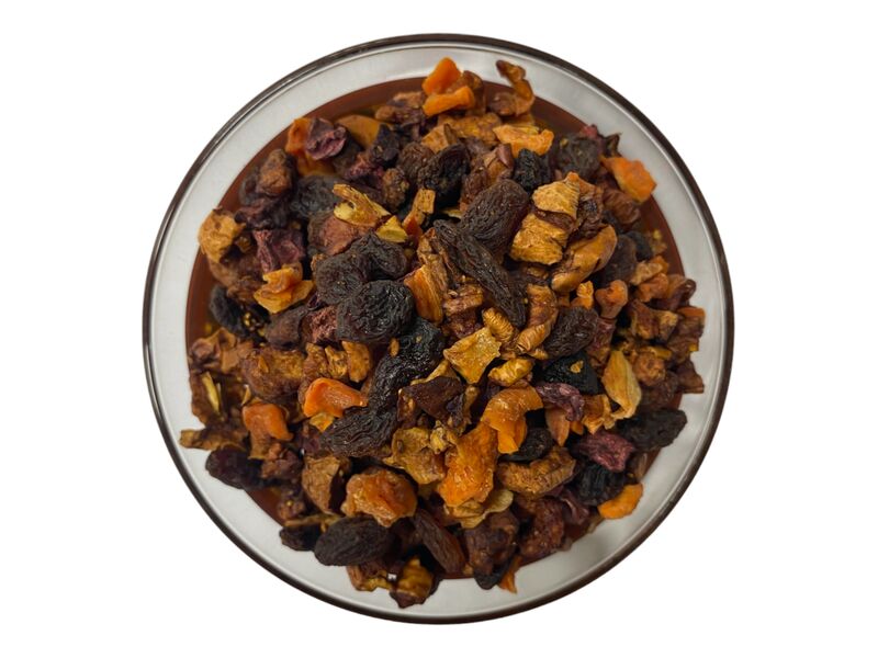 Apfelstücke, Karottenstücke, Rote Beetestückchen, Himbeeren, Erdbeere, Weinbeeren, Aroma mit Waldfrucht-Sahne.