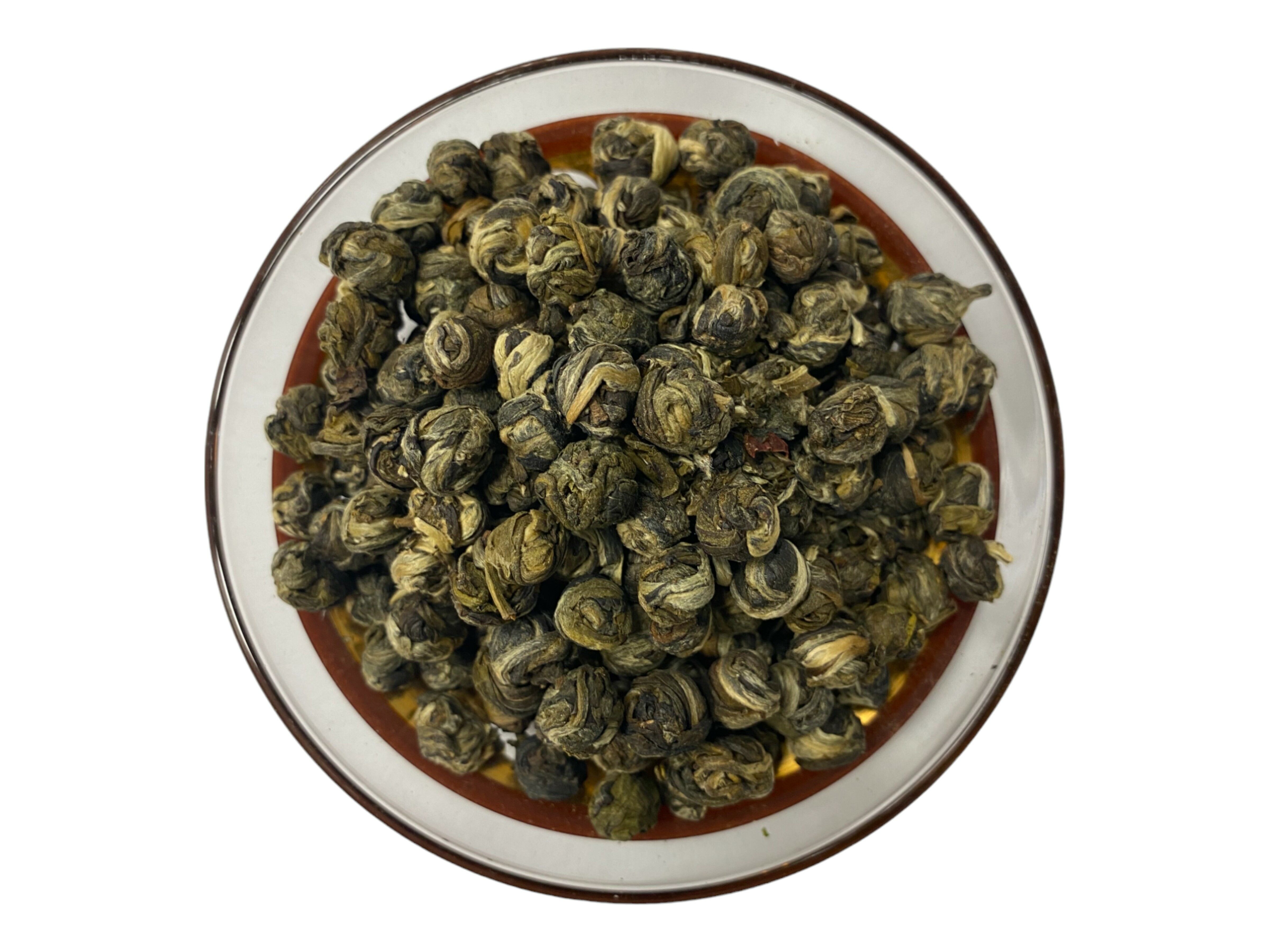 Ein absoluter Spitzentee chinesischer Teemanufaktur aus der Frühlingsernte. Die zu kleinen Teekugeln gerollten Blattknospen verströmen einen süßlichen Jasminduft. Der Aufguss ist honiggelb, mit weichem, blumigem Geschmack. Ein Tee für den Jasmingenießer.