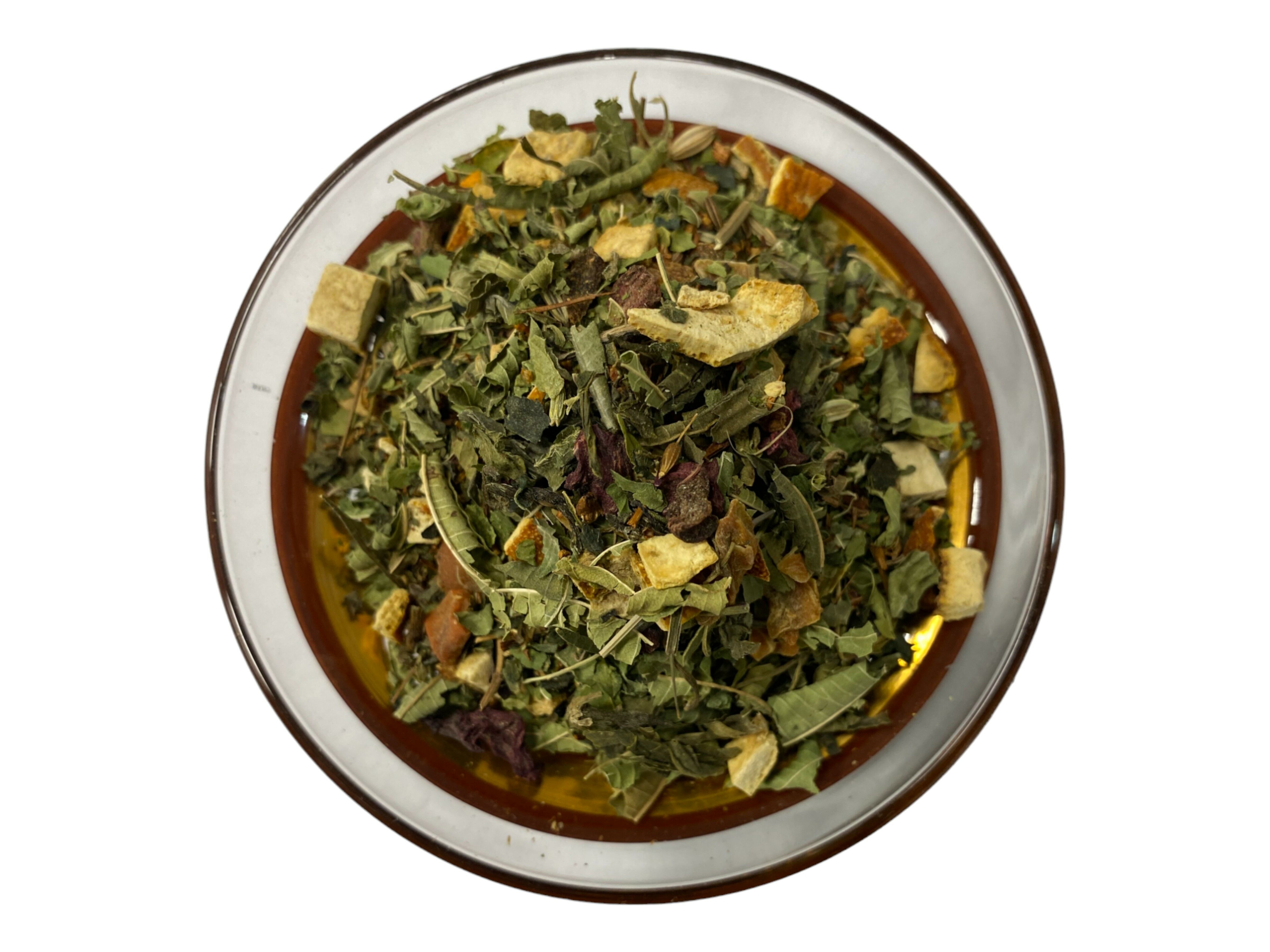 Rooibos, Orangenschalen, Eisenkraut, Karottenstücke, Brennesselblätter, Anis, Fenchel, Kümmel, China Sencha, Spinatflocken, Schlehdornblüten, Rote Beetestücke, Magnesiumcarbonat.