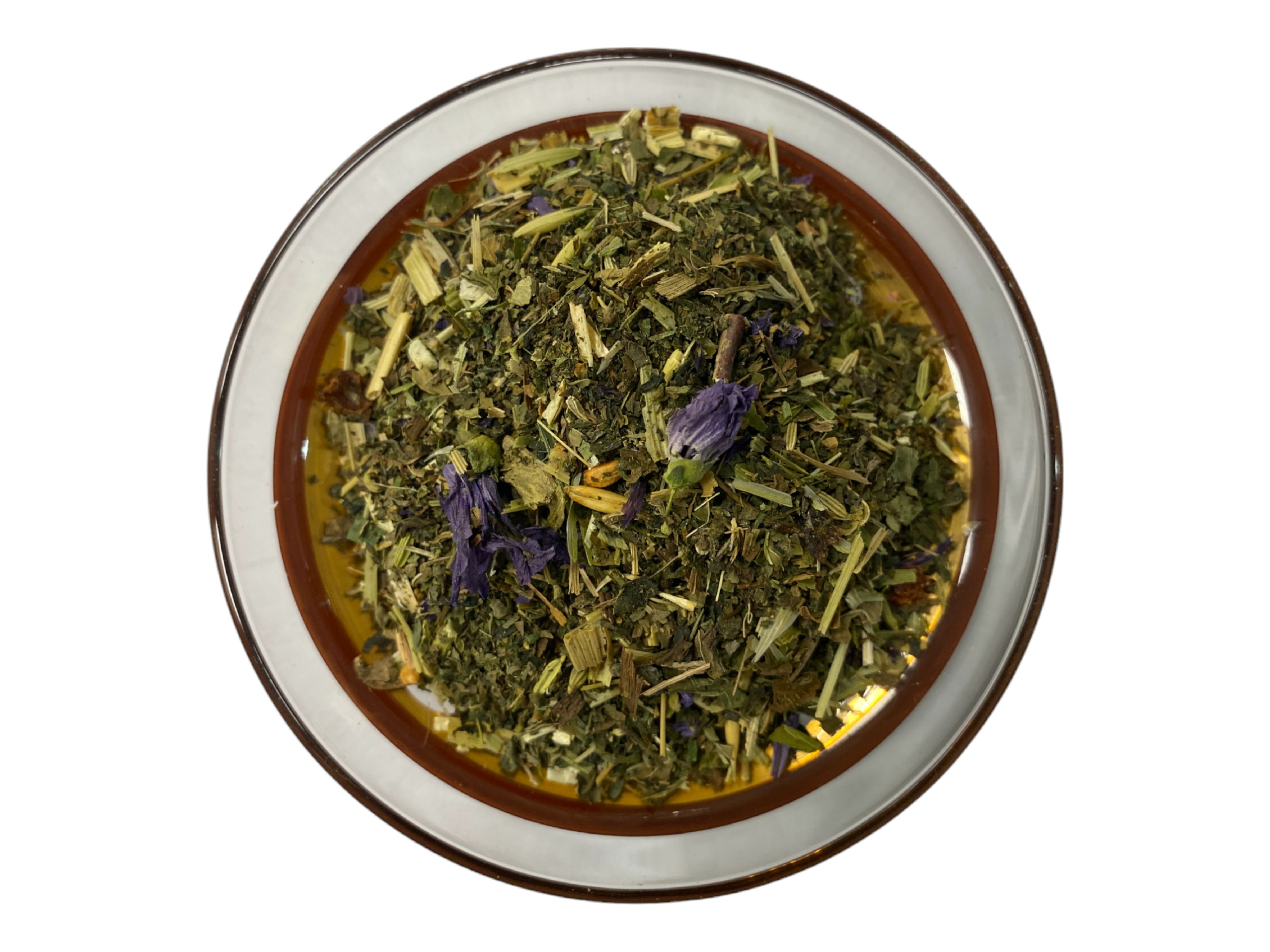 Brennesselblätter, Nanaminze, Pfefferminzblätter, grüner Hafen, Hagebuttenschalen, Fenchel, Riesengoldrutenkraut, Malvenblätter, Löwenzahnkraut, natürliches Aroma, Malvenblüten, Rosenblütenblätter.
