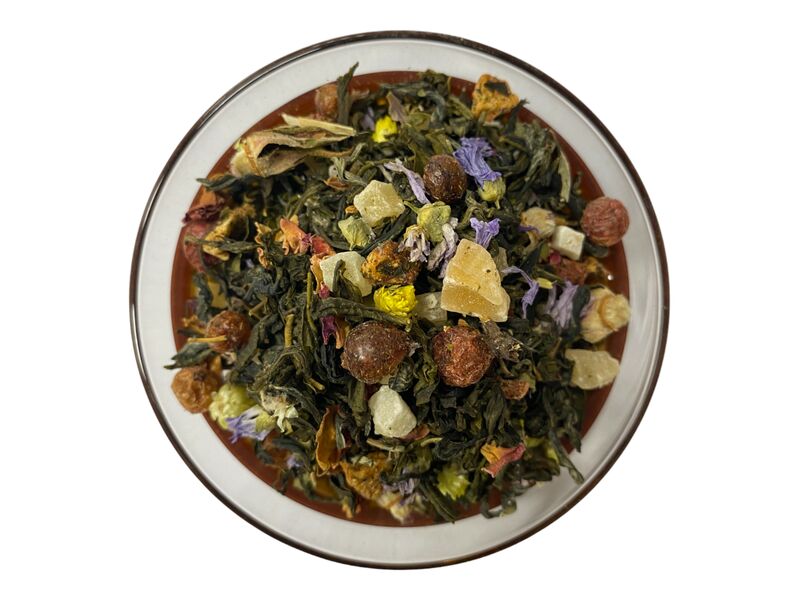 Weißer Tee Mao Feng, kandierte Ananas-, Papaya- und Mangostücke, Aroma, rote Johannisbeere, Rosenblüten, Erdbeerstücke, Jasminblüten, Malvenblüten, Katzenpfötchenblüten.